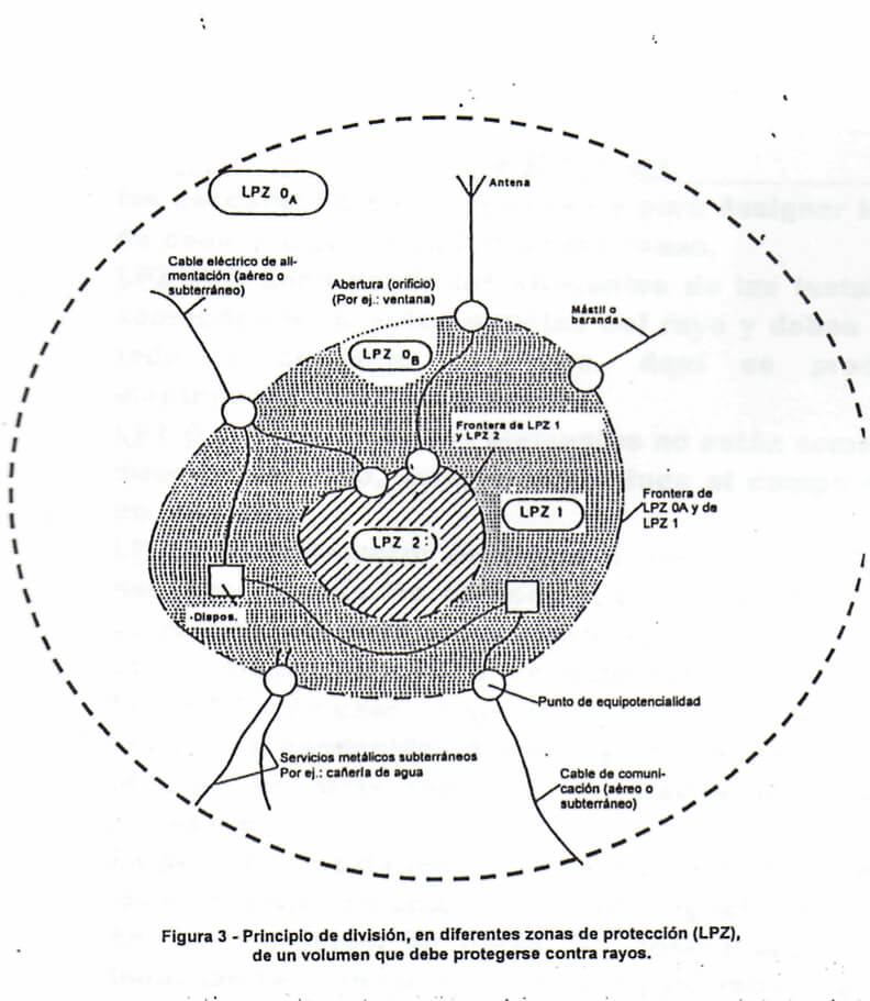 La estructura a protegerse se dividirá en zonas de protección contra rayos, para definir zonas de diferentes acciones dañinas de las descargas o sobretensiones y para designar lugares de puntos de conexión en los límites de las zonas.