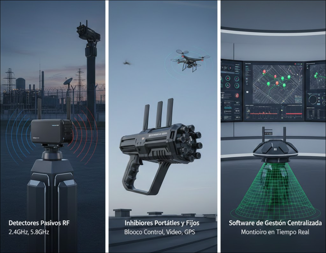 • Detectores pasivos RF: Detección temprana de señales de drones en bandas comunes (2.4 GHz, 5.8 GHz y otras).